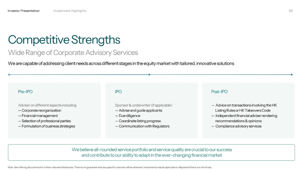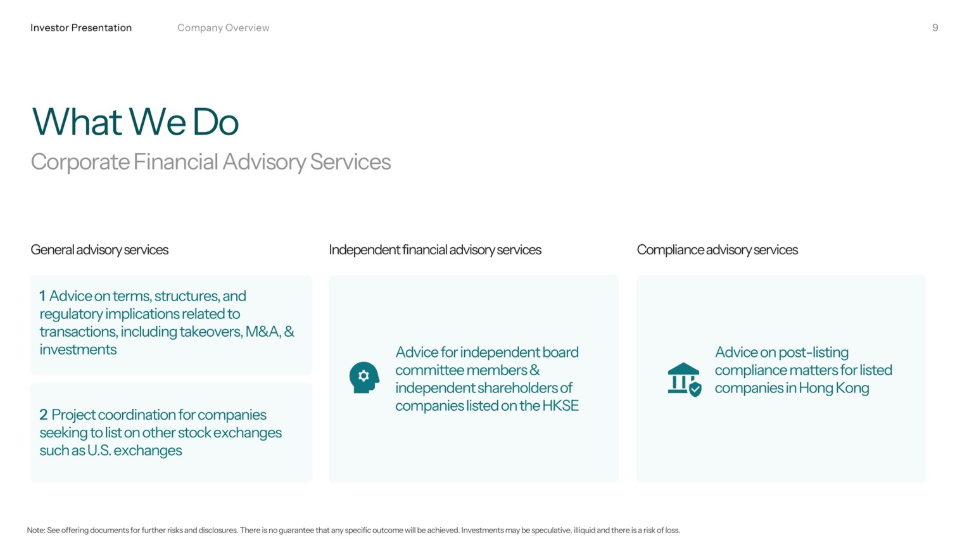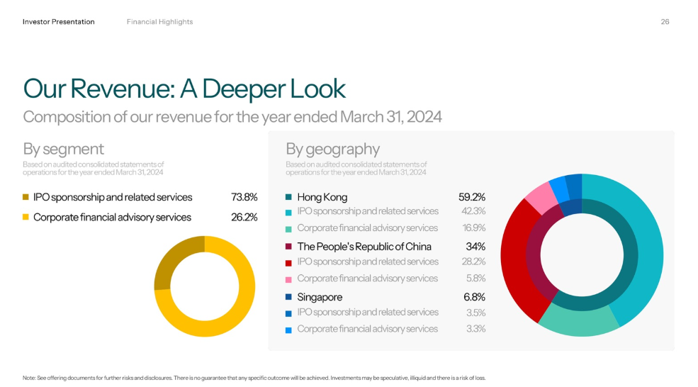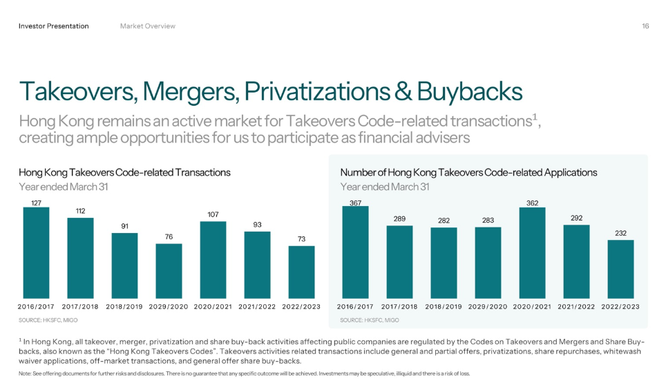 - 独立财务顾问服务:主要包括向香港联交所上市公司的独立董事委员会和独立股东提供建议和意见,并根据某些里程碑的成就以进度款支付固定费用,例如提交给联交所上市公司监管机构的批准和/或在香港联交所发布相关文件。