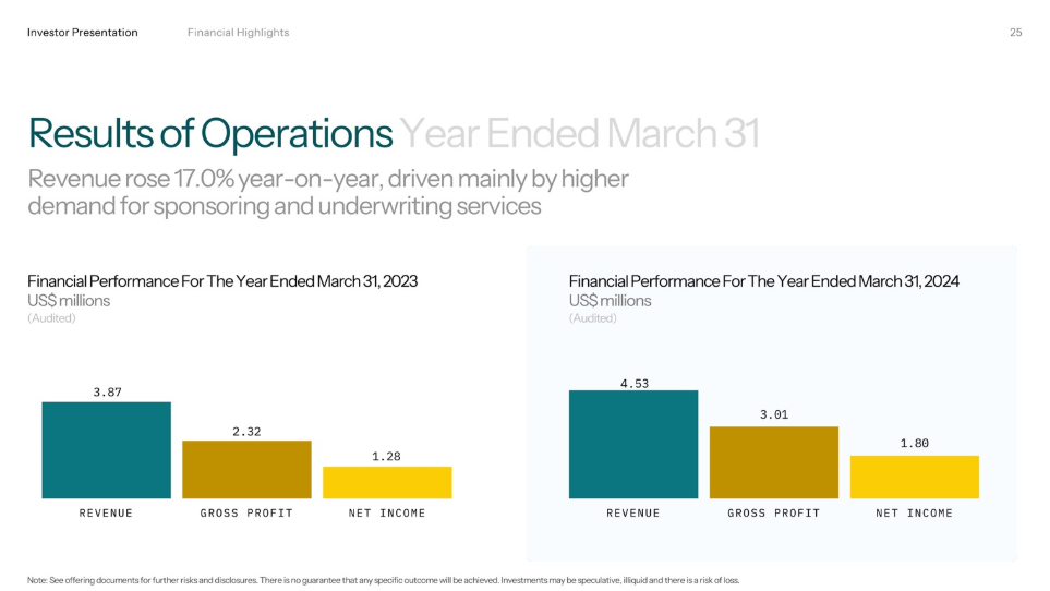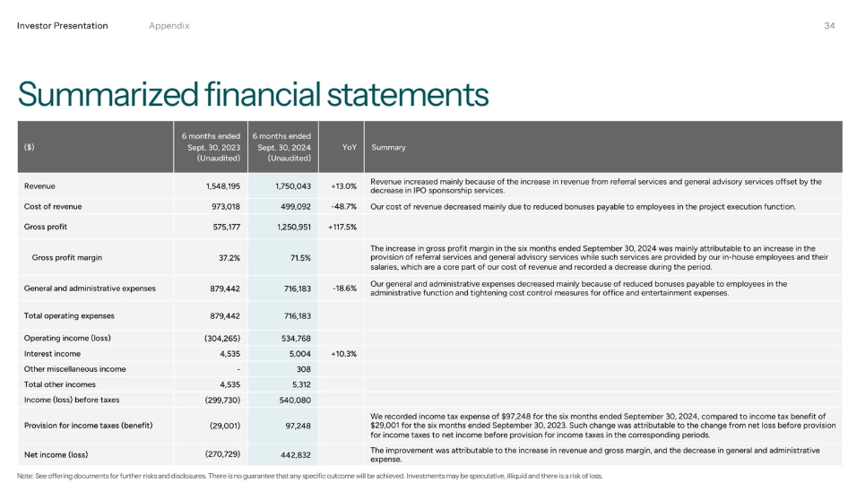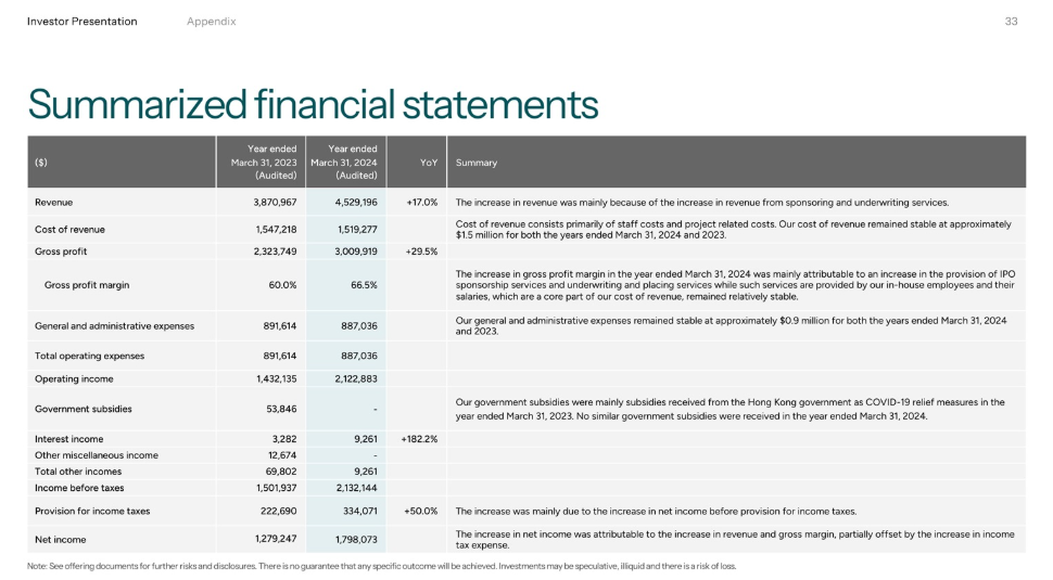 招股书显示,在过去的2023财年、2024财年(财政年度结束日期为3月31日)和2025财年前六个月(截至2024年9月30日),均富融资的收入分别为387.10万、452.92万和 175.00万美元,相应的净利润分别为127.92万、179.81万和 44.28万美元。