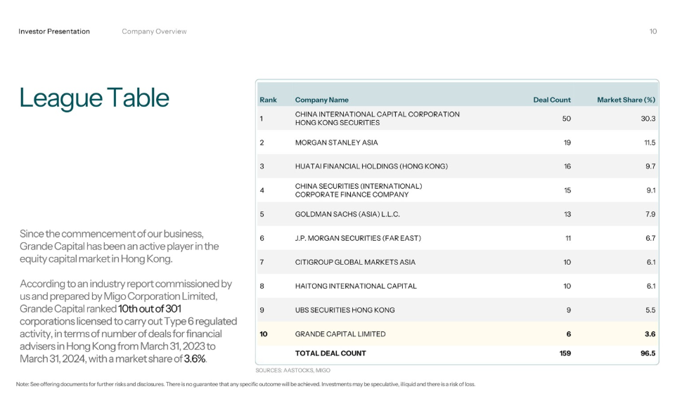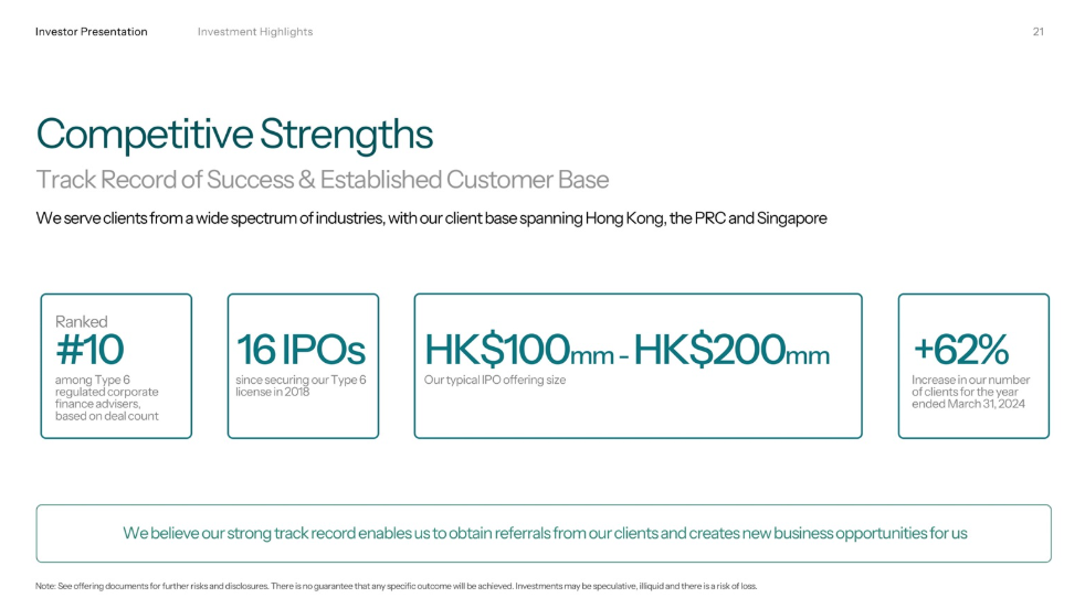 根据行业报告,截至2024年3月31日年度,就在香港的财务顾问交易数量而言,均富融资在总共301家获发牌进行第6类受规管活动的持牌法团中排名第10位,市场份额为3.6%。均富融资自2018年1月23日首次持牌以来 ,已保荐并完成了16宗在港交所成功完成的IPO。在过去的2023财年、2024财年和2025财年前六个月,均富融资分别保荐并完成的香港IPO分别为3宗、3宗和0宗,分别有2家、0家和1家上市申请人授权均富融资作为其香港IPO的上市保荐人。自2024年9月30日至招股说明书日期,均富融资未收到任何新的上市保荐委托。